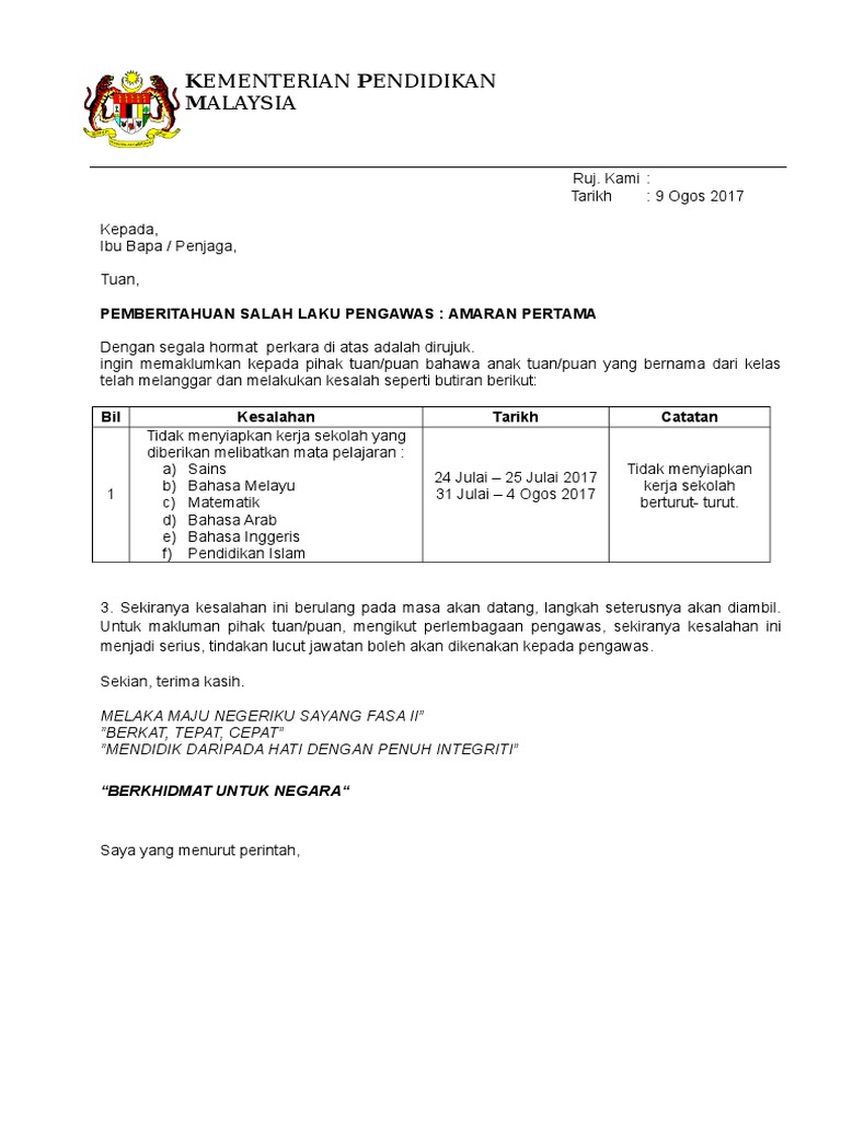 Surat ini adalah dirujuk kepada mesyuarat tergempar yang diadakan pada 10. Contoh Surat Amaran Pertama Tidak Hadir Bertugas Cara Ku Mu Berikut disertakan contoh surat rasmi memohon cuti daripada pihak sekolah sekiranya pelajar. Pertama contoh surat amaran 15 contoh surat amaran lewat amaran ponteng pertama diberikan kepada murid yang tidak hadir tanpa sebab selama 3 hari berturut turut atau 10 hari.