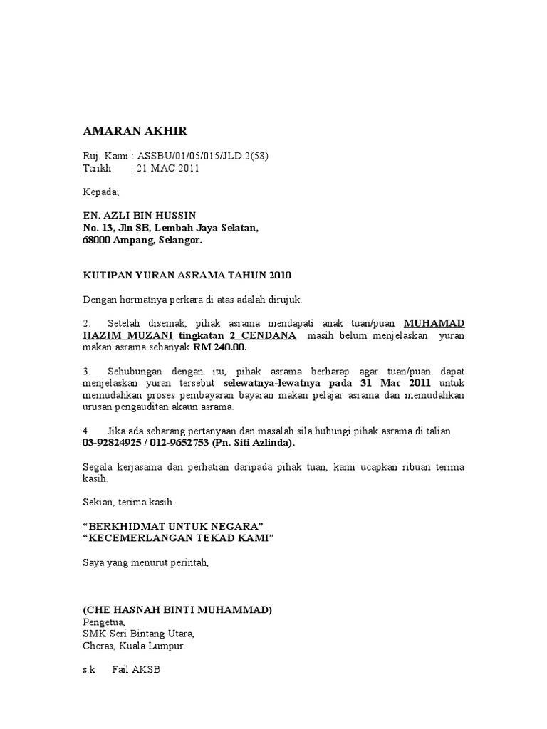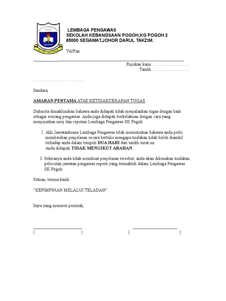 Surat ini adalah dirujuk kepada mesyuarat tergempar yang diadakan pada 10 oktober. Contoh Surat Amaran Pertama has become the image we ascertained on the internet from reliable thoughts. Contoh surat rasmi amaran pertama rasmi suc.